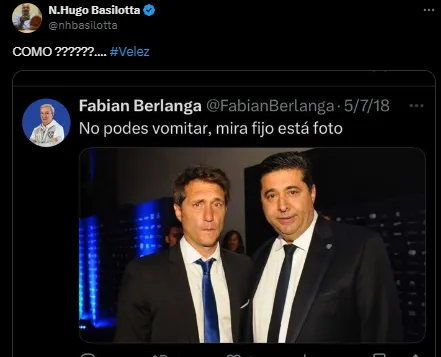 Hugo Basilotta, reconocido empresario e hincha de Vélez, fue quien compartió el antiguo tuit que fue borrado por Berlanga. No es la primera vez que se localizan declaraciones de este tipo ya que antes de enfrentar a Boca en Copa Argentina también se encontraron tuits contra el Xeneize, en algunos casos con fuertes exabruptos.