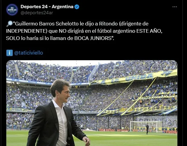 La información fue revelada por el periodista Claudio Civello, fuente que confirmó que Independiente le ofreció el cargo de entrenador a Guillermo Barros Schelotto y el ex jugador de Boca rechazó la propuesta. Sin embargo, esto no fue todo y la fuente agregó que el DT únicamente dirigirá en el fútbol argentino si lo llaman de Boca.
