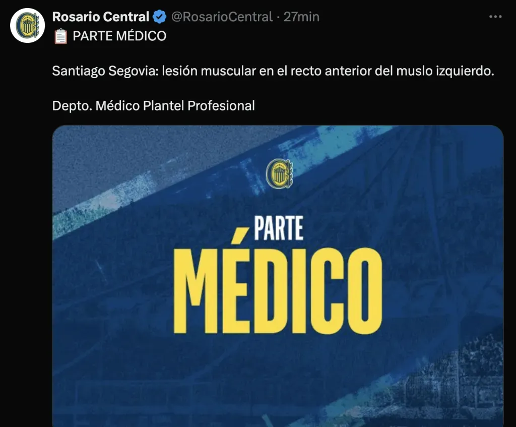 El domingo 14 de septiembre por la tarde, Boca va a estar enfrentándose a Rosario Central por la fecha 8° del Torneo Clausura. Y en la noche previa al importante partido, el Canalla confirmó la lesión de uno de sus jugadores: Santiago Segovia.