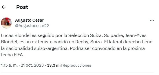 Blondel nació en Argentina, sí. Y claro que puede ser llamado por Lionel Sacaloni si así lo considera. Pero tiene la doble nacionalidad y, de recibir un llamado en la próxima fecha FIFA, podrá representar sin problemas a Suiza: una Selección más que competitiva que llegó a los 8vos de final del Mundial de Qatar 2022. ¿Será citado?