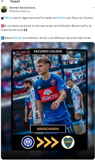 “Boca abrió negociaciones formales con Inter por Facundo Colidio. El contacto se dio en las últimas horas entre Román-Bolotnicoff y la directiva del club italiano. Desde el Xeneize prometieron enviar una oferta en las próximas horas”, aseguró el productor. En 2017, Inter le pagó a Boca 9 millones de euros por su joya (transkermarket). ¿Ahora será el Xeneize el que pondrá la plata para repatriarlo?