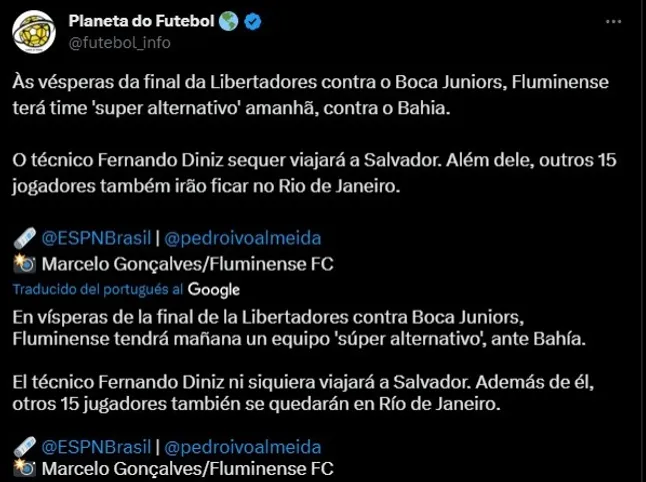 El entrenador del conjunto de Río de Janeiro, Fernando Diniz, no viajará junto a su equipo por el compromiso del torneo local, información que pudo ser revelada por ESPN Brasil en las últimas horas. ¿El motivo? El DT pondrá un equipo ‘súper alternativo’ por lo que ni siquiera estará presente en el cotejo y se quedará en la ciudad junto a otros 15 jugadores titulares.