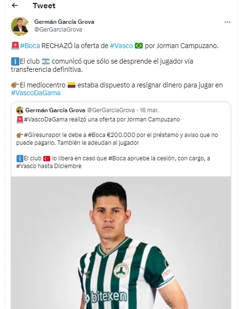 Según contó el periodista Germán García Grova, el club brasileño le ofreció a Boca un préstamo con cargo hasta el mes de diciembre. Pero el mismo habría sido rechazado. “El club argentino le comunicó que solo se desprende del jugador vía transferencia definitva”. Campuzano tiene vínculo vigente ccoon el Giresunspor hasta mediados del 2023 y luego deberá regresar a Boca. Por ahora, no se va a Brasil.