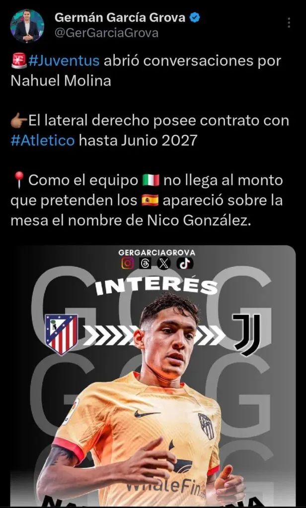 El periodista Germán García Grova reveló que la Juventus abrió conversaciones para incorporar a Nahuel Molina en este mercado de pases. Y agregó que el cuadro de Italia no tiene el dinero suficiente para poder contratar al lateral de Atlético Madrid únicamente a través de una transferencia.