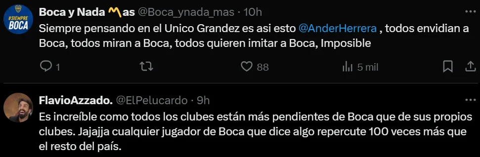 “Es increíble como todos los clubes están más pendientes de Boca que de sus propios clubes. Jajajja cualquier jugador de Boca que dice algo repercute 100 veces más que el resto del país“, escribió otro hincha. Sin dudas, los comentarios que más se replicaron fueron sobre la importancia que tiene el conjunto de la Ribera en el fútbol argentino y por qué es el Único Grande.