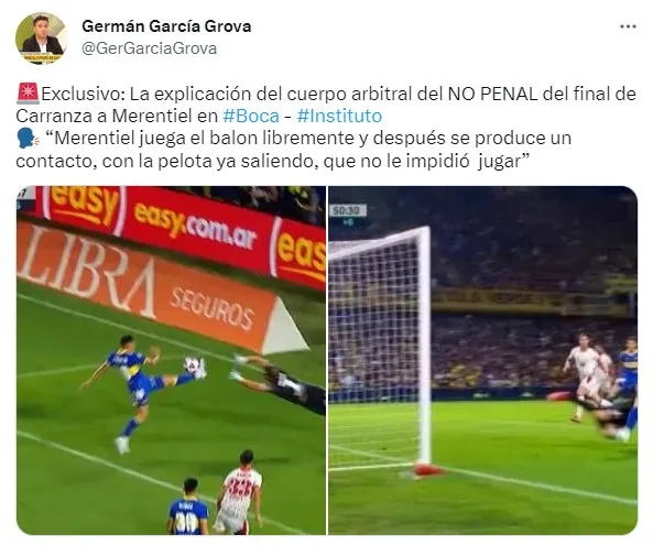 “Merentiel juega el balon libremente y después se produce un contacto, con la pelota ya saliendo, que no le impidió jugar”, explicaron desde el cuerpo arbitral, según publicó el periodista de TyC Sports. Se hablará mucho de esto durante toda la semana, al igual del pobre nivel que mostró el último campeón.
