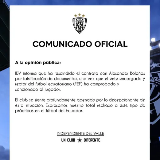 “IDV informa que ha rescindido el contrato con Alexander Bolaños por falsificación de documentos, una vez que el ente encargado y rector del fútbol ecuatoriano (FEF) ha comprobado y sancionado al jugador“, comienza este anuncio.