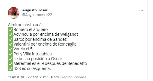 Enumerando una lista de conclusiones del DT desde que llegó al Xeneize, el periodista Augusto César sorprendió marcando que los dos intocables para el entrenador son Pol Fernández y Sebastián Villa, quienes recibieron elogios de Juan Román Riquelme hace pocos días. Además, Valentín Barco, Alan Varela y Nicolás Valentini, son otros de los que ganaron terreno con su llegada.