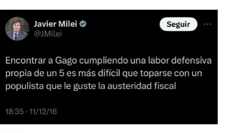 De esta manera, el ahora político, citó en 2016: “Encontrar a Gago cumpliendo una labor defensiva propia de un 5 es más difícil que toparse con un populista que le gusta la austeridad fiscal”. Y también, agregó en otro tuit: “Es que eso era darle chances al inútil de Gago, quien tiene menos marca que la salada”.