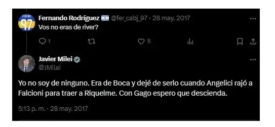En otra ocasión Javier Milei explicó por qué decidió dejar de ser hincha de Boca. Fue en el año 2017, a través justamente de su cuenta de Twitter en donde respondió la consulta de algunos de seguidores.