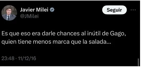 De esta manera, el ahora político, citó en 2016: “Encontrar a Gago cumpliendo una labor defensiva propia de un 5 es más difícil que toparse con un populista que le gusta la austeridad fiscal”. Y también, agregó en otro tuit: “Es que eso era darle chances al inútil de Gago, quien tiene menos marca que la salada”.