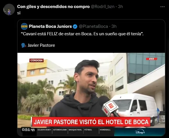 Una vez que se retiró del hotel, Pastore dialogó con ESPN y dio detalles de su visita al plantel de Boca: “Estuve con Edi (Cavani) más que todo. Los otros chicos estaban haciendo sus cosas, no quise invadir su espacio. Sé que el día de partido es importante, así que estuve con Cavani y su familia que vino a pasar unos días con nosotros. Estuvimos muchos años juntos y era un lindo momento para estar con él”.