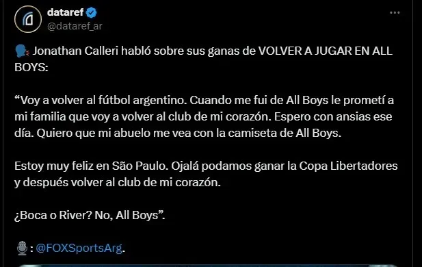 Si bien queda tiempo para el se termine el vínculo del delantero en Brasil, Calleri habló de su futuro. Y confesó que le gustaría regresar al fútbol argentino en algún momento. Pero reveló que su deseo no es volver a vestir los colores de Boca.