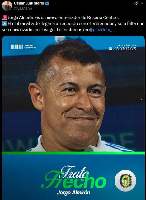 El DT ya llevaba unos cuantos meses sin trabajo tras su partida de Colo Colo. Esta pequeña inactividad llegó a su fin y el entrenador, con pasado en Boca, tiene todo listo para tomar las riendas de un club que será rival directo en la pelea por varias competencias. Según informó el periodista César Luis Merlo, Almirón es el nuevo estratega de Rosario Central.
