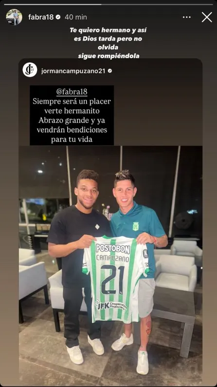 El lateral se reencontró con su compatriota después de mucho tiempo y en su cuenta de Instagram, compartió la ‘storie’ del mediocampista de 29 años, sumando un mensaje de aliento. “Te quiero hermano y así es Dios, tarda pero no olvida, sigue rompiéndola“, escribió el defensor.