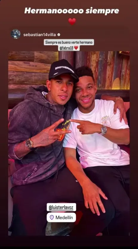 Además de su aparición en redes junto a Campuzano, el lateral izquierdo también compartió fotos junto a Sebastián Villa, hoy en Independiente Rivadavia de Mendoza. “Siempre es bueno verte hermano“, escribió el delantero colombiano en Instagram junto a su colega en Medellín.