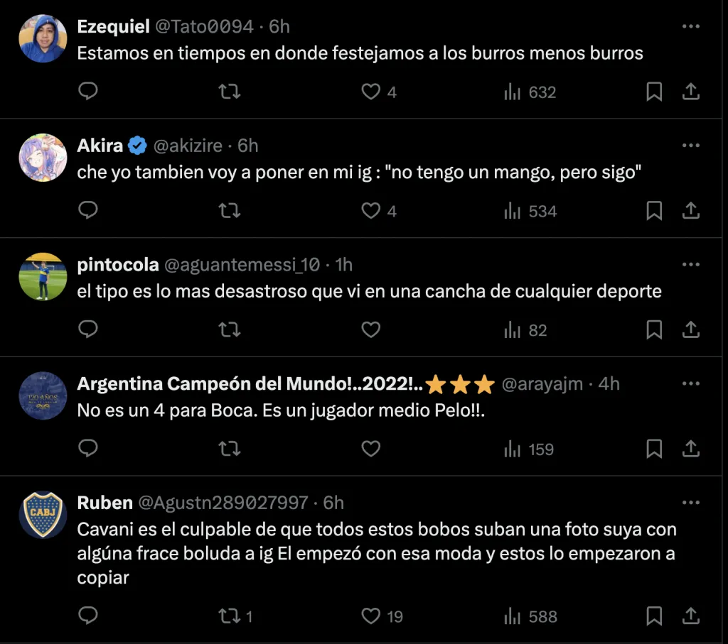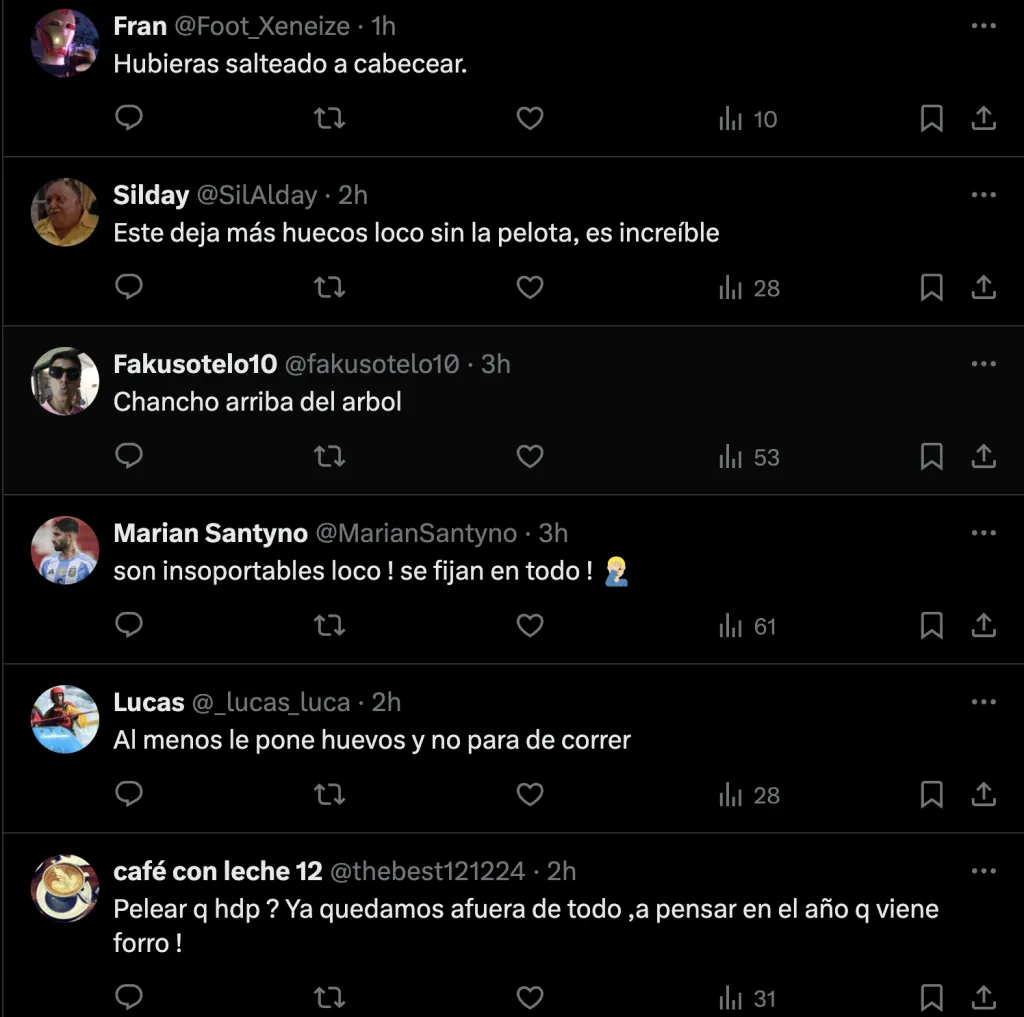 Como era de esperarse, esto generó las reacciones de los hinchas en las redes. Y después de 12 partidos sin ganar, más el bajo rendimiento del jugador, los fanáticos no perdonaron: “Hay que pelearla desde el principio“, “Hubieras salteado a cabecear“, y “Ni tienen que agarrar el celular perros“.