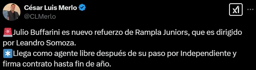El periodista César Luis Merlo reveló que Buffa será nuevo jugador de Rampla Juniors, equipo de la Primera División de Uruguay. El futbolista de 36 años llega libre tras su paso por Independiente, donde no tuvo mucha continuidad. A su vez, firmará con el equipo charrúa hasta fin de año.