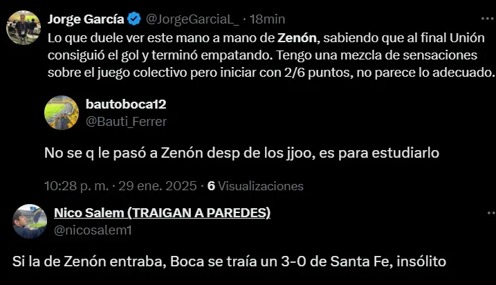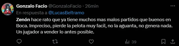 Los simpatizantes del Xeneize no lo perdonaron y apuntaron contra el mediocampista ofensivo por sus discretas producciones en el último tiempo que lo llevó perder protagonismo dentro del plantel. “Zenón hace rato que tiene muchos más malos partidos que buenos en Boca”, sostuvo un hincha. Otros alegaron que luego de los Juegos Olímpicos, bajó su nivel. “No sé qué le pasó a Zenón después de los Juegos Olímpicos, es para estudiarlo”, manifestó.