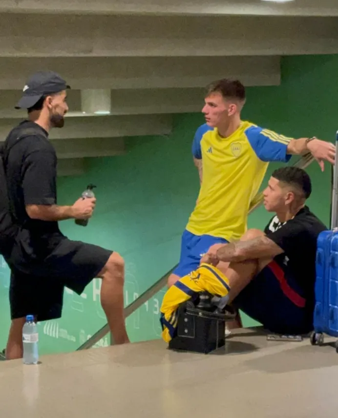 Una vez que el encuentro finalizó, se lo vio junto a Emanuel Brítez e Imanol Machuca, con quienes compartió equipo en Unión de Santa Fe. Entre 2021 y 2022 los tres jugaron para el Tatengue, siempre en la máxima categoría del fútbol argentino. Por otra parte, se puede observar que todos están con sus pertenencias y que el volante del Xeneize habría intercambiado su camiseta con Machuca, ya que se encuentra una en la matera que está a su lado.