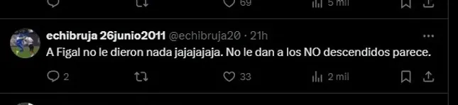 Entre todos estos factores, los fanáticos del Unico Grande dieron a entender que hay una diferenciación entre Boca y River, tanto desde el club de Avellaneda como sus hinchas. “A Figal no le dieron nada jajaja como se nota“, “El problema es que es traición si juega en Boca” o “Che pero Figal???” fueron algunos de los comentarios en “X” (Twitter).