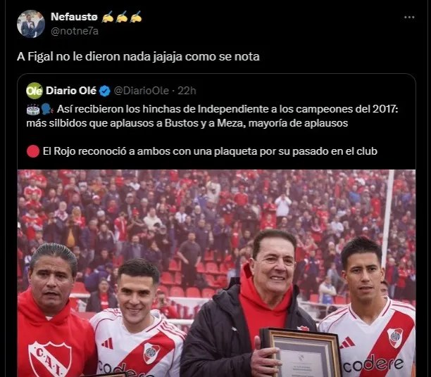 Si bien, no sumó muchos minutos, formó parte de la coronación en este prestigioso certamen, pero no fue reconocido en sus últimas visitas a Avellaneda, a diferencia de lo que sucedió el domingo con sus colegas. Por otro lado, la relación de los simpatizantes de Independiente con estos jugadores también marcó su distancia con Figal, Bustos y Meza.