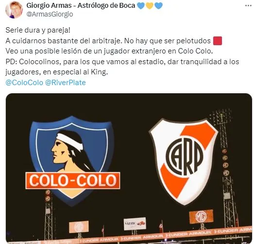 Esta noche se enfrentarán en Chile por el partido de ida y el astrólogo, vinculado al cuadro de la Ribera, le lanzó una advertencia al Cacique mediante las redes sociales. “Serie dura y pareja! A cuidarnos bastante del arbitraje. No hay que ser pelotudos. Veo una posible lesión de un jugador extranjero en Colo Colo”, escribió en su cuenta de “X” (Twitter).