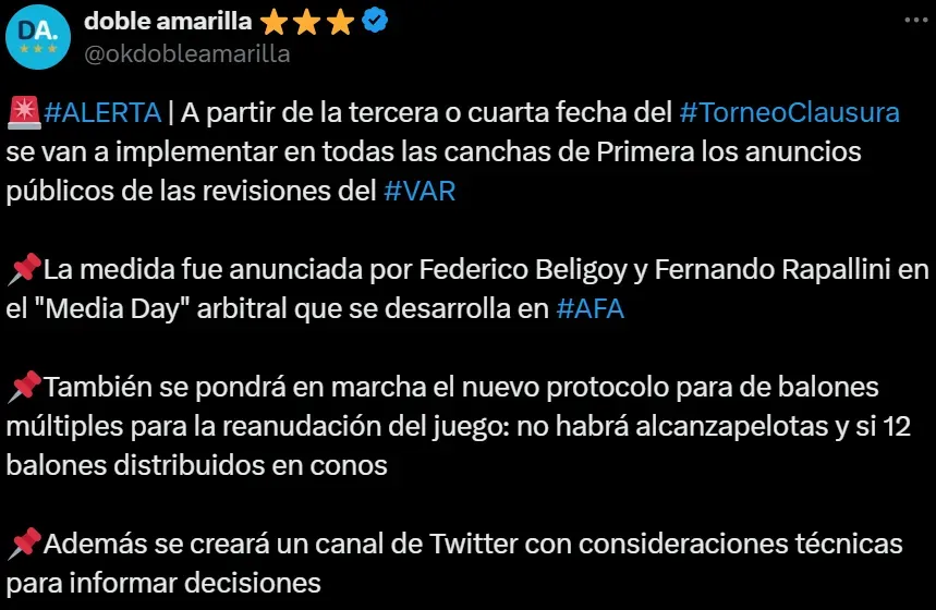 Según informó el medio Doble Amarilla, a partir de este torneo, los árbitros deberán informar vía micrófono las decisiones que tomen en la cancha (similar al Mundial de Clubes). Se espera que este aspecto entre en vigor a partir de la fecha 3 o 4. Por otro lado, habrá una cuenta de X (Twitter) que se dedicará a explicar e informar los fallos arbitrales, al igual que sucede en la Premier League.