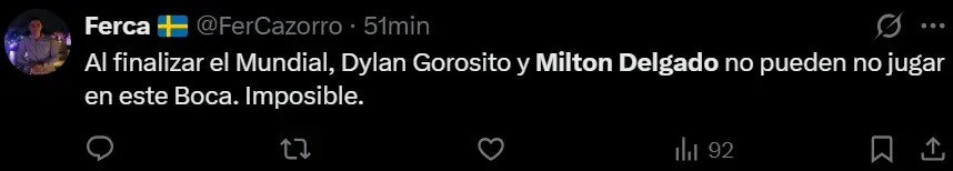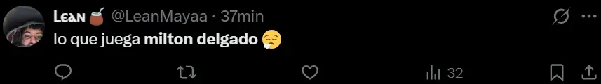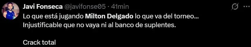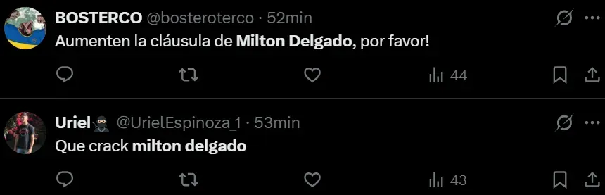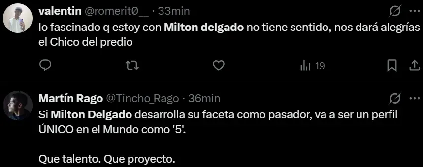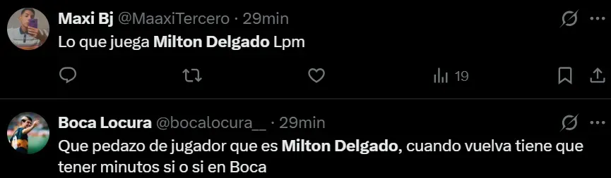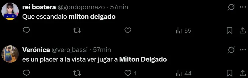 “Lo que juega Milton Delgado”, “Que pedazo de jugador es Milton Delgado, cuando vuelva tiene que tener minutos sí o sí en Boca”, “Lo fascinado que estoy con Milton Delgado no tiene sentido”, fueron algunos de los comentarios. Cabe destacar que desde la llegada de Miguel Russo, Delgado perdió mucho terreno y hasta el momento, acumuló un puñado de minutos con la camiseta Xeneize.
