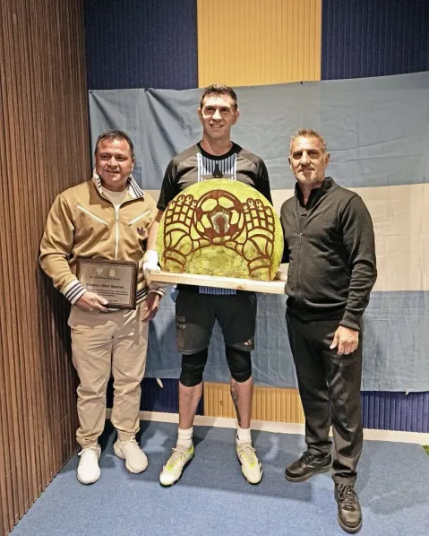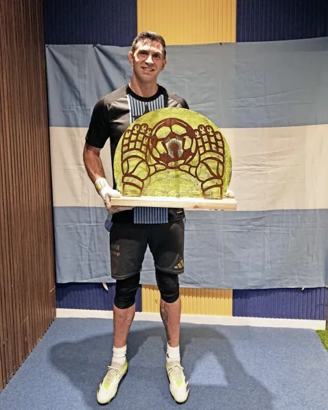 Semanas atrás, el ‘Dibu’ fue premiado en la gala del Balón de Oro y recibió el galardón al mejor arquero del mundo. Y en su visita a La Bombonera, Raúl Cascini y Marcelo Delgado, integrantes del Consejo de Fútbol, le entregaron una plaqueta en reconocimiento a esta premiación.