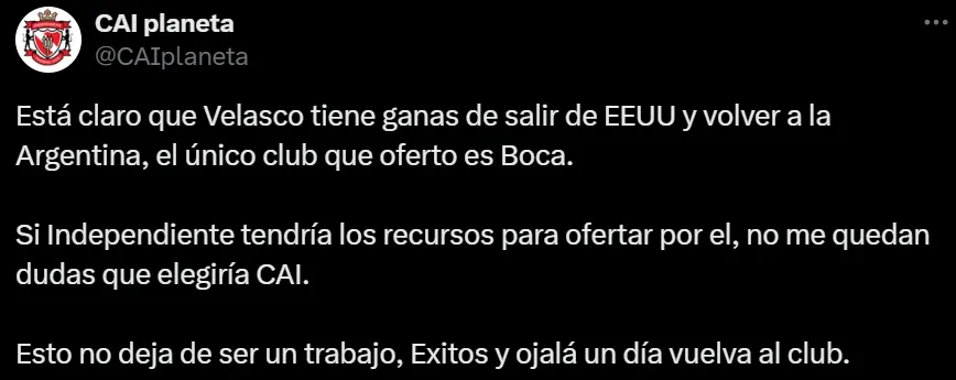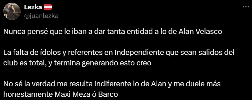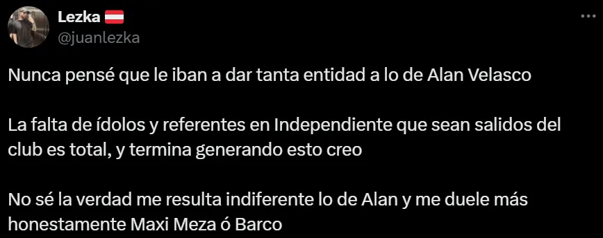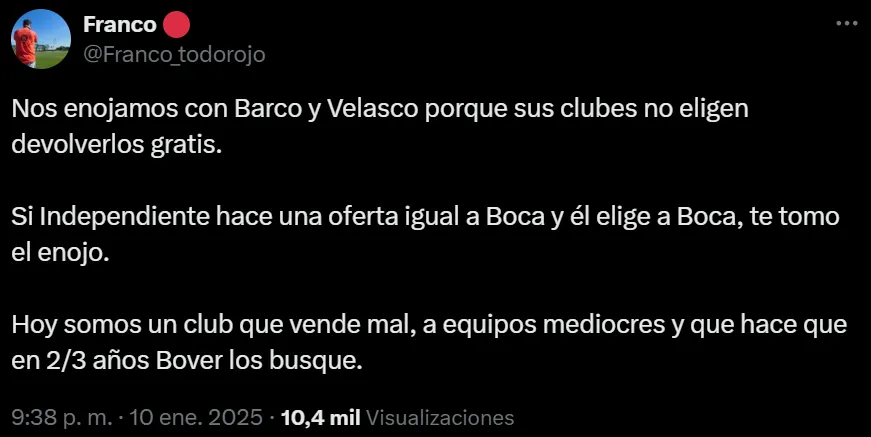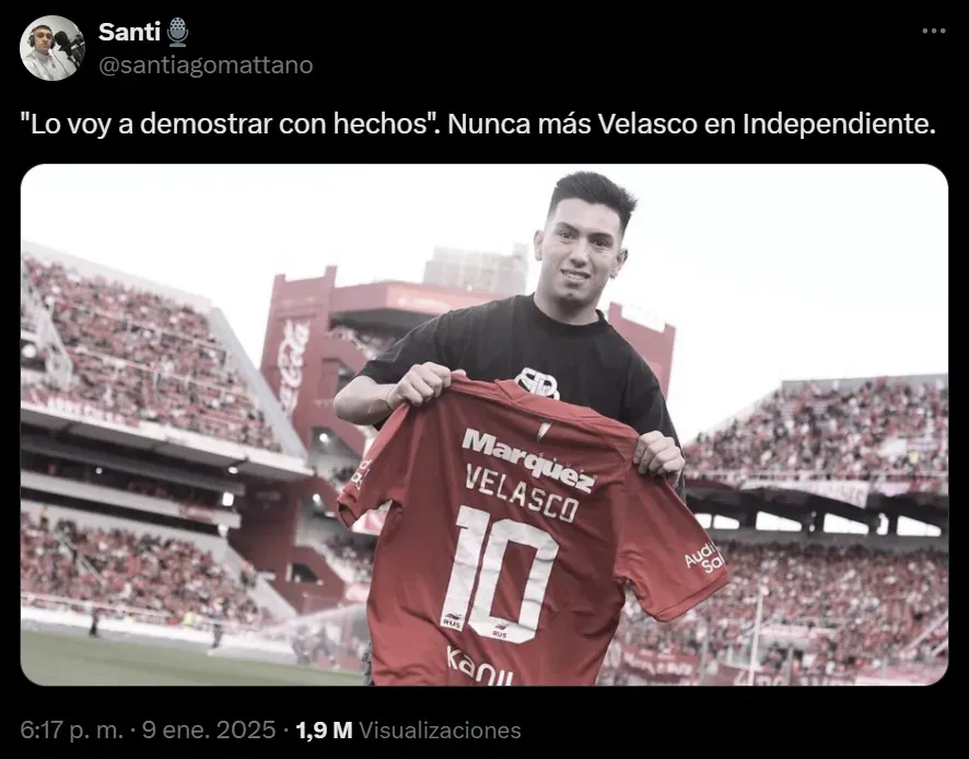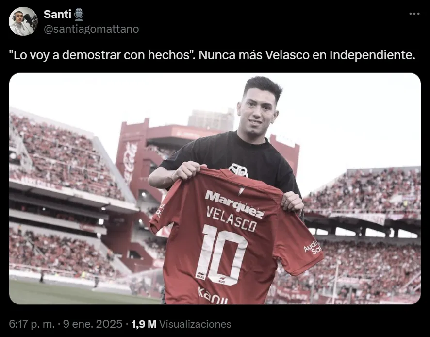 En las redes sociales, los hinchas del Rojo opinaron sobre el arribo del futbolista de 22 años al cuadro de la Ribera. Algunos mostraron su enojo por la decisión que tomó el jugador: “‘Lo voy a demostrar con hechos’. Nunca más Velasco en Independiente“, repudió un simpatizante.