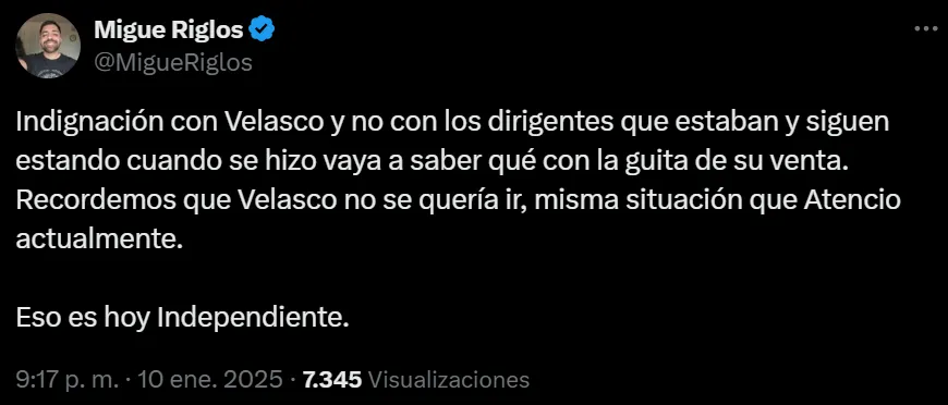 A su vez, varios hinchas del elenco de Avellaneda, dejaron ver su decepción ante los malos manejos de la dirigencia de su club. “Indignación con Velasco y no con los dirigentes que estaban y siguen estando cuando se hizo vaya a saber qué con la guita de su venta“, acusó un fanático del Rojo sobre el presente de Independiente.