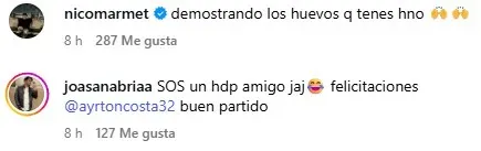 Los hinchas del Único Grande, atentos a la publicación de Ayrton, lo felicitaron con todo tipo de comentarios. “Vamo’ turro“, “Lo tuvo de hijo” o “Sacate a Salas del bolsillo genio” fueron algunos de los comentarios. Incluso, varios compañeros también le comentaron el post con elogios.