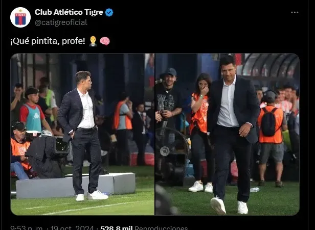 “¡Qué pintita, profe!“, escribieron desde la cuenta oficial de Tigre en “X” con el agregado de una foto de Sebastián Domínguez, DT del cuadro de Victoria. Sin embargo, el mensaje estaba también dedicado para Fernando Gago, nuevo entrenador del Xeneize.