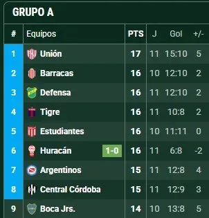 Con los 47 puntos que cosechó se ubica en el cuarto lugar, en zona de Copa Sudamericana, pero una alegría ante la Lepra cambia todo. En zona de fase de grupos aparecen Rosario Central (50 unidades) y River Plate (49 unidades), mientras que Argentinos Juniors se estaría quedando con el puesto en repechaje (48 unidades).