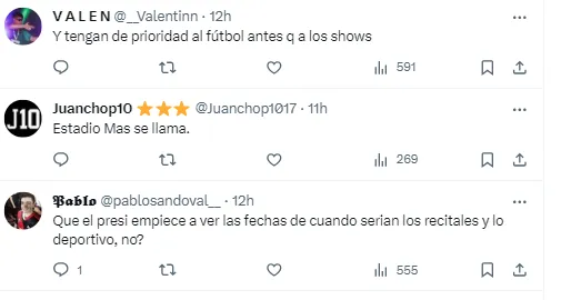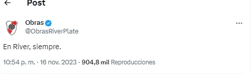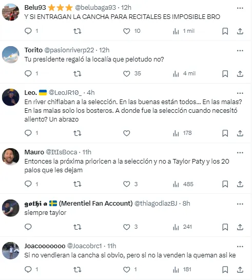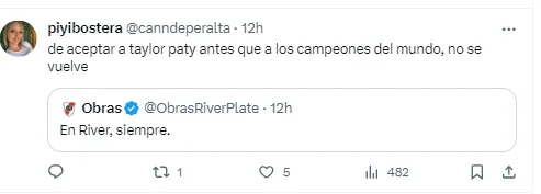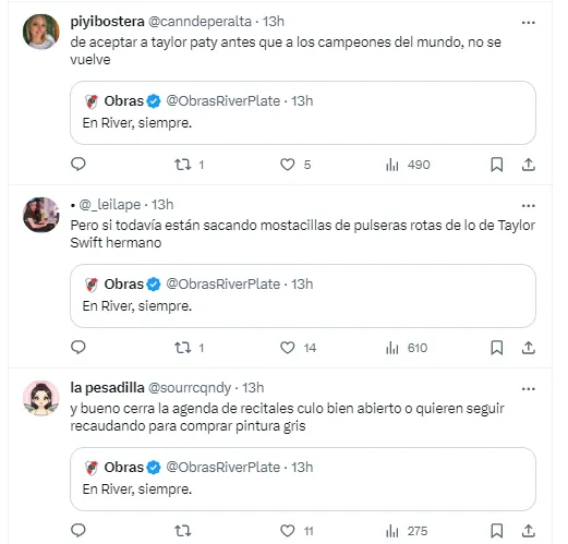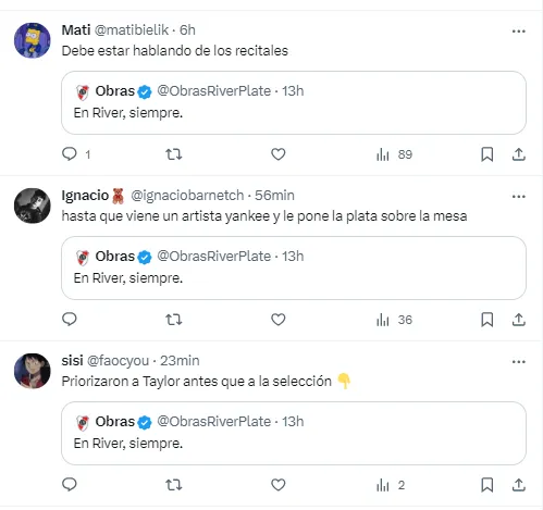 “En River, siempre”, fue el tweet de la cuenta “Obras River Plate”. Pero las resupuestas en su contra se multiplicaron con el paso de los minutos. Y no solo de hinchas de Boca, sino también de los propios fanáticos del Millonario que le echaron en cara ceder la sede para albergar los recitales de Taylor Swift.