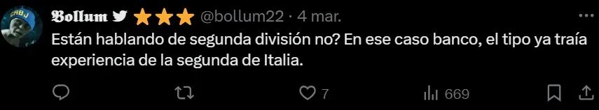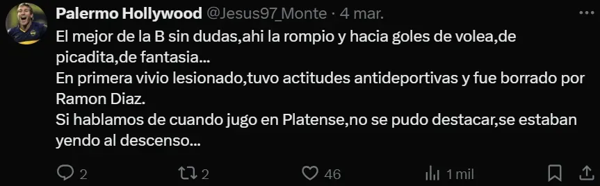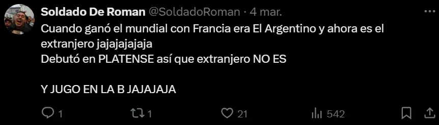 En ese sentido, los simpatizantes del Único Grande no lo perdonaron y retrucaron el posteo del elenco francés. “El mejor de la B, sin dudas, ahí la rompió. En Primera vivió lesionado, tuvo actitudes antideportivas y fue borrado por Ramón Díaz”, expresó un hincha recordando el paso del eterno rival en la segunda categoría de nuestro fútbol. “¿Están hablando de Segunda División no? En ese caso banco, el tipo ya traía experiencia de la segunda de Italia”, escribió otro recordando el paso de Juventus, donde jugó por 10 años, en la Serie B de aquel país.