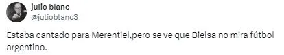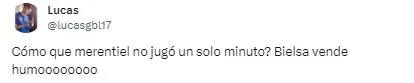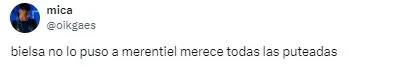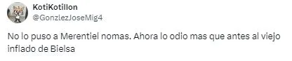 El motivo estuvo vinculado al delantero del Único Grande y al no sumar minutos en el Estadio Centenario, estallaron de bronca contra el ‘Loco’. Muchos fanáticos, que ya habían realizado un pedido en redes, se expresaron en “X” (Twitter) y aparecieron comentarios como “Es un papelón“, “Ahora lo odio más” o “Bielsa no mira fútbol argentino“.