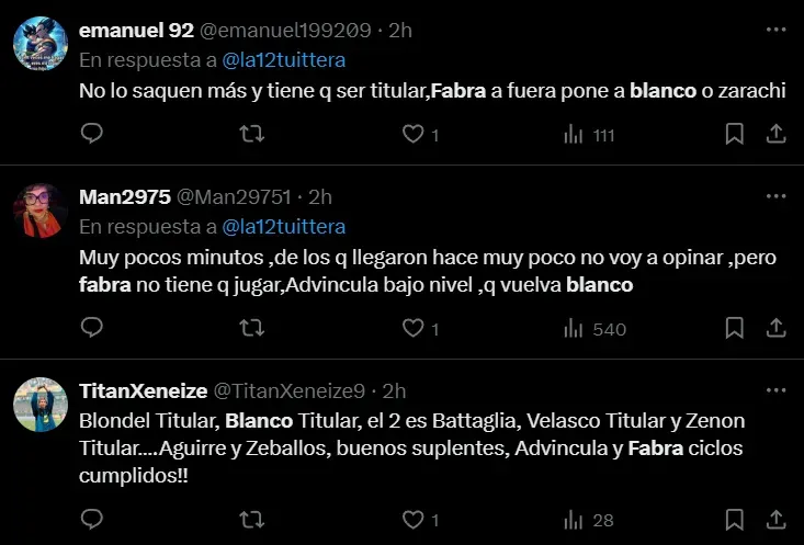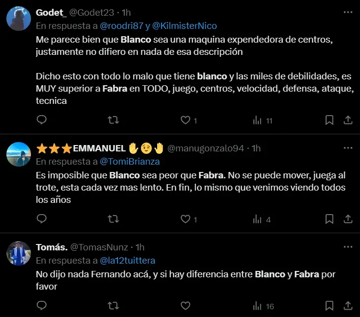 “Es inentendible que no juegue Blanco”, “Es imposible que Blanco sea peor que Fabra” y “Fabra no tiene que jugar, que vuelva Blanco”, fueron algunos de los comentarios que se repitieron entre los fanáticos en las redes sociales.