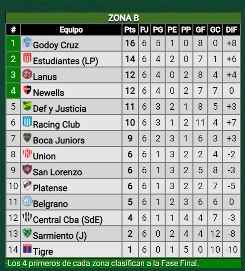 El equipo de Diego Martínez suma 9 puntos y está en la 7ma posición de la Zona B, a tras de Lanús y Newell’s (los últimos que se estarían clasificando a la próxima fase, con doce unidades). Por encima de Boca, antes de los puestos de clasificación, están Racing y Defensa y Justicia.