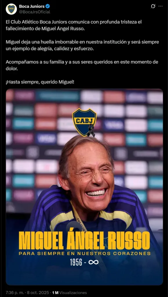 Ahora, tras conocerse la noticia, desde el club despidieron al DT con un sentido comunicado: “El Club Atlético Boca Juniors comunica con profunda tristeza el fallecimiento de Miguel Ángel Russo. Miguel deja una huella imborrable en nuestra institución y será siempre un ejemplo de alegría, calidez y esfuerzo. Acompañamos a su familia y a sus seres queridos en este momento de dolor. ¡Hasta siempre, querido Miguel!”.