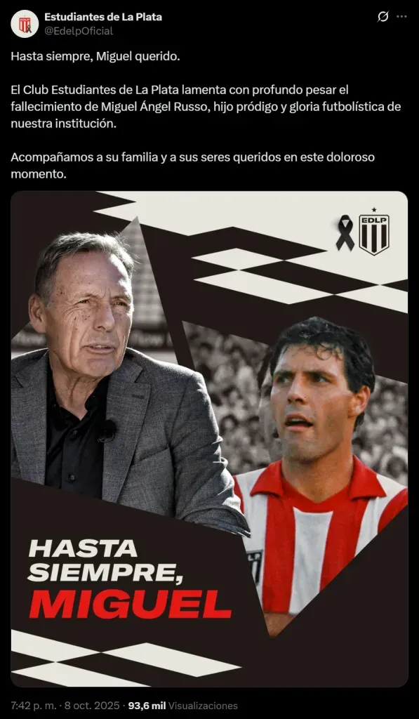 Desde las redes oficiales, el “Millonario” publicó unas sentidas palabras para el entrenador de Boca. “River Plate lamenta profundamente el fallecimiento de Miguel Ángel Russo, entrenador de Boca Juniors y con una destacada trayectoria en el fútbol como jugador y DT. Nuestra Institución acompaña a sus familiares y seres queridos en este triste momento”, expresaron desde el elenco de Núñez.