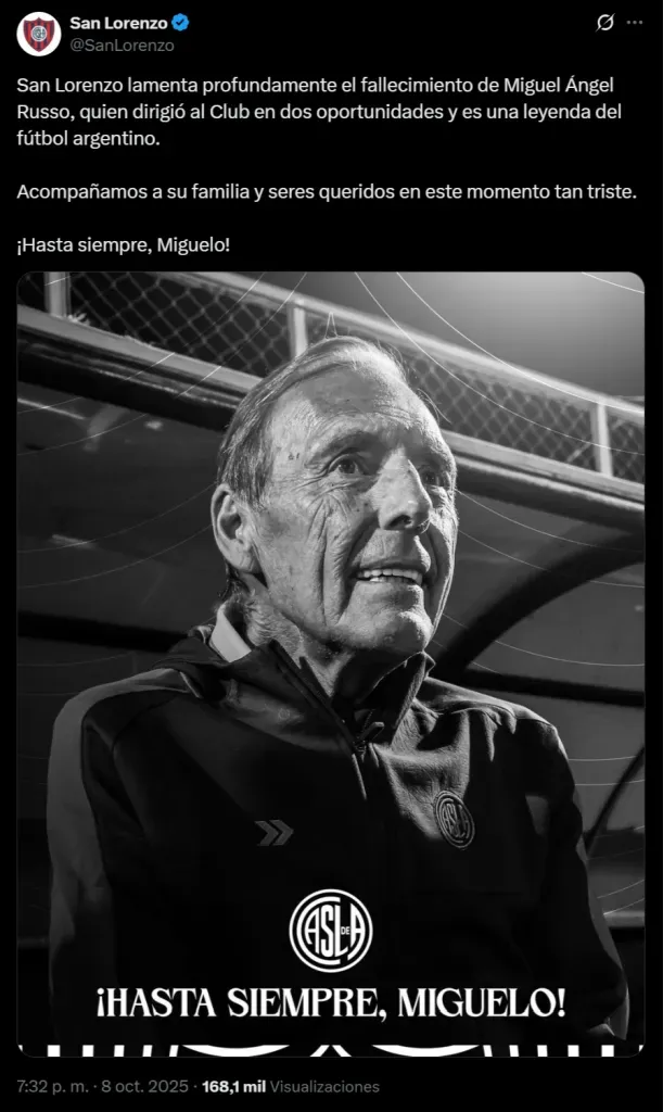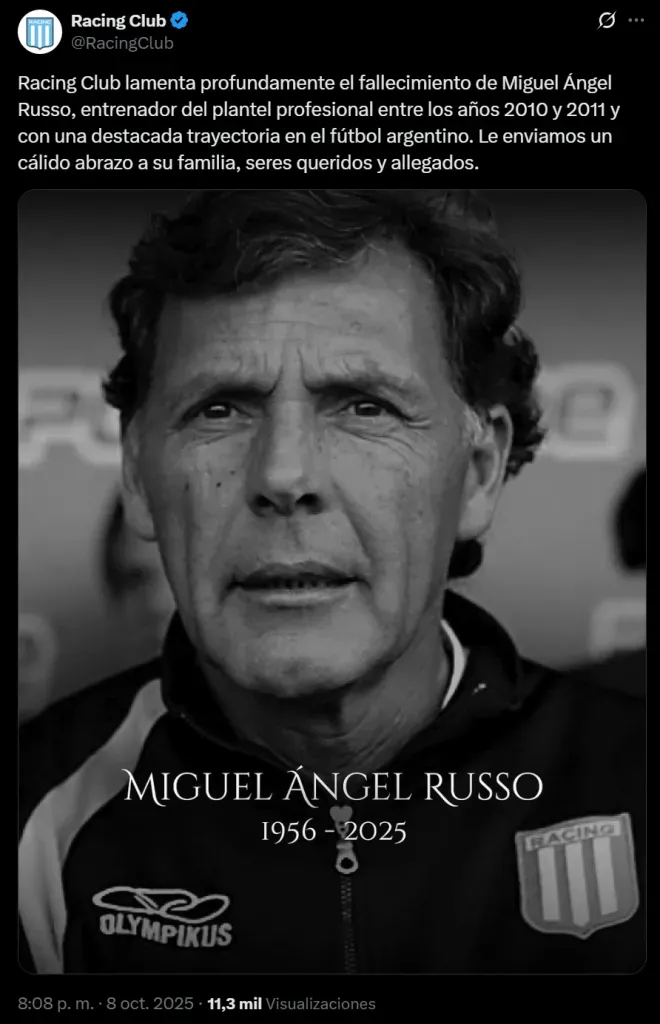 A su vez, el fútbol argentino también despidió a Russo y muchísimos equipos dejaron sus mensajes tras conocer la noticia. Uno de ellos fue River, quien en sus redes aprovechó para emitir un comunicado oficial lamentando la partida del DT Xeneize.