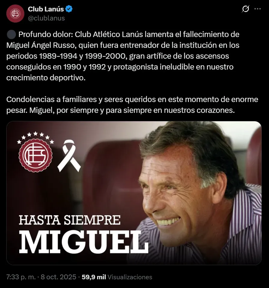 El fútbol argentino está de luto por la partida de Miguel Russo. Varios equipos del fútbol argentino dejaron su mensaje para despedir al entrenador luego de haber fallecido en su casa. Uno de los que emitió un comunicado lamentando la noticia, fue River.