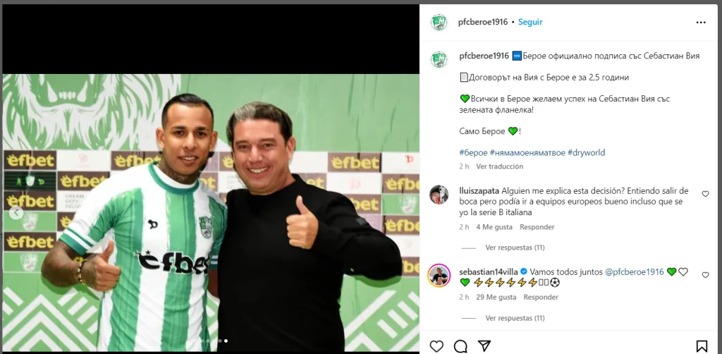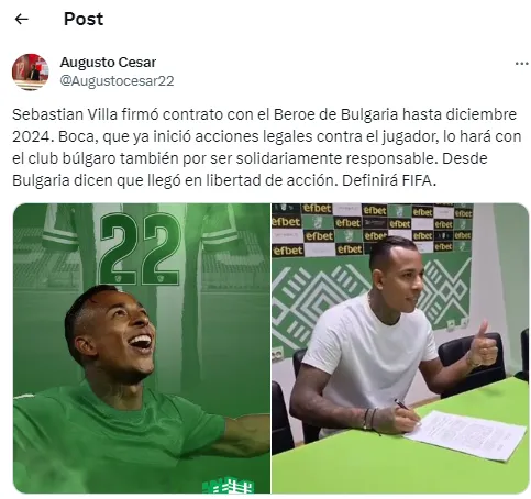 Ya es oficial. Sebastián Villa firmó con el Beroe FC y jugará en la Primera División de Bulgaria. El extremo lo hizo en condición “jugador libre” hasta diciembre del 2024 y es por eso que Boca ahora prepara una doble denuncia.