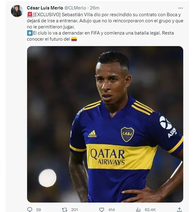 En un principio, Villa se marchó a Colombia para estar con su familia y comenzó a mandar cartas de documento exigiendo volver a ser tenido en cuenta por Jorge Almirón en el plantel profesional. La respuesta de Boca fue que regrese a entrenarse al predio de Ezeiza. Y así lo hizo, pero para hacerlo de forma diferenciada. Fue entonces que el equipo legal del extremo siguió insistiendo para que vuelva a vestirse de azul y oro hasta que un día dejó de presentarse y argumentó que “daba por rescindido” su contrato con el club de la Ribera.