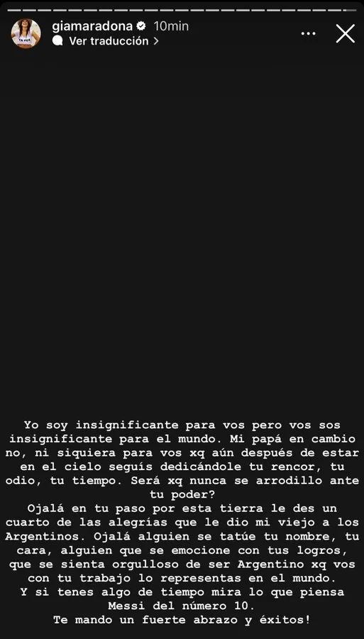 El repudio en las redes sociales fue grande. No solo los fanáticos de Diego le salieron al cruce al empresario, sino también Giannina Maradona, una de las hijas del ídolo popular: “Yo soy insignificante para vos, pero vos sos insignificante para el mundo. Mi papá en cambio no, ni siquiera para vos porque aún después de estar en el cielo seguís dedicándole tu rencor, tu odio, tu tiempo”.