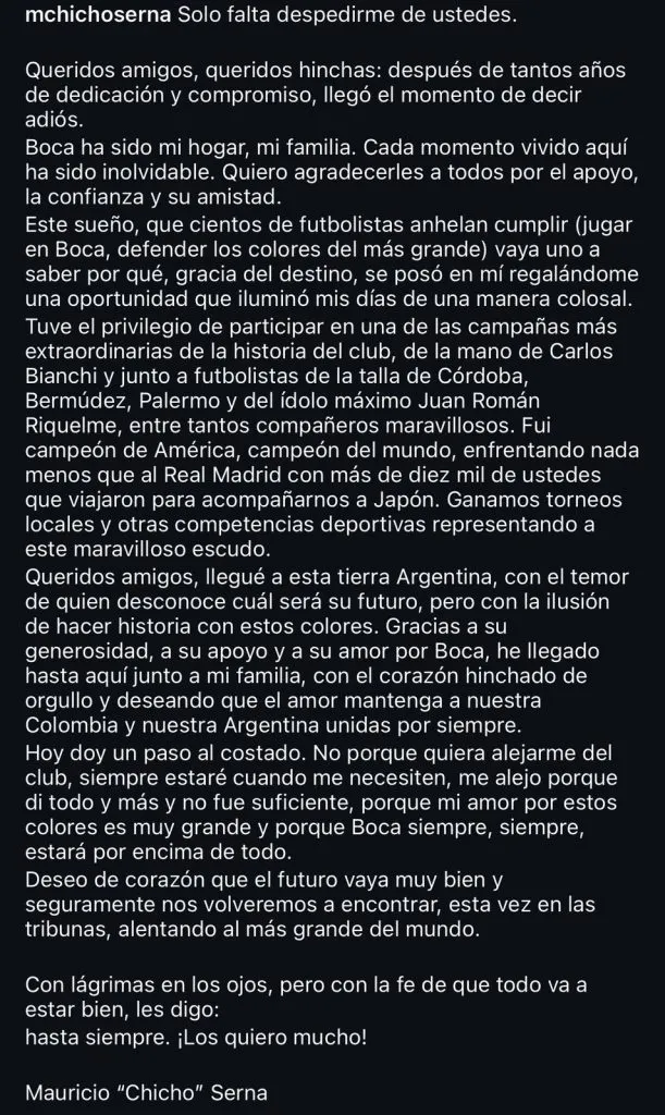 En su cuenta de Instagram, Serna explicó el motivo de su decisión. “Hoy doy un paso al costado. No porque quiera alejarme del club, siempre estaré cuando me necesiten, me alejo porque di todo y más y no fue suficiente, porque mi amor por estos colores es muy grande y porque Boca siempre, siempre, estará por encima de todo”, escribió en un pasaje de la larga carta.