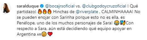 “Qué partidazo! Hinchas de River, calminhaaa“, escribió la joven atajándose de las respuestas que se le iban a venir de parte de los fanáticos del Millonario. Luego, procedió a explicar por qué había ido a ver el encuentro del Xeneize: “No se pueden enojar con Sarinha porque esto no es ella, es Penélope, uno de los muchos personajes de Sara“.