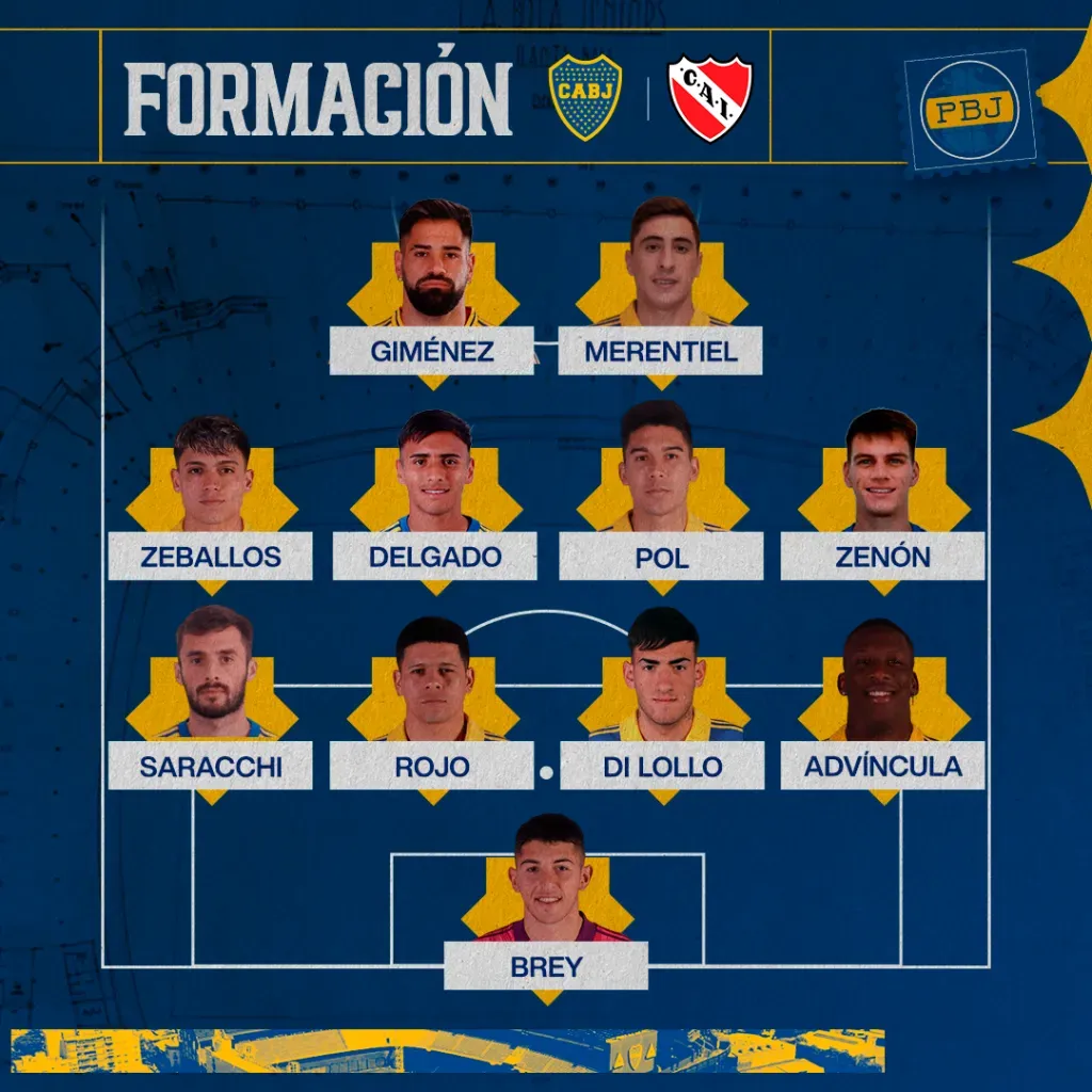 El Xeneize saldrá a jugar con: Leandro Brey; Luis Advíncula, Lautaro Di Lollo, Marcos Rojo, Marcelo Saracchi; Pol Fernández, Ignacio Miramón; Kevin Zenón, Milton Giménez, Miguel Merentiel, Exequiel Zeballos.